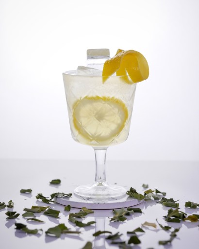 Shake together ingredients except yuzu juice with ice and strain into glass. Top with sparkling yuzu and garnish with lemon peel and drop in a lemon wheel