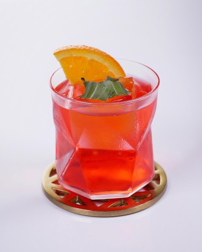 Stir with ice / Strain / Garnish with orange slice and pandan