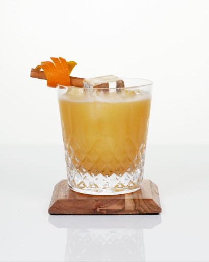Shake together with ice. Strain into glass over ice. Garnish with orange peel and cinnamon stick.